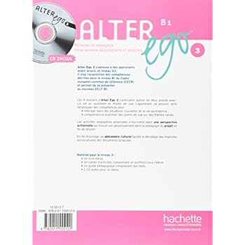 Structure :Les 9 dossiers d'Alter Ego 3 s'articulent autour de deux grands axes :→ La vie au quotidien et Points de vue. L'apprenant va pouvoir ainsi développer des compétences pour : interargir dans des situations courantes de la vie quotidienne ; comprendre et exprimer des points de vue sur des thèmes variés.→ Les activités langagières proposées s'inscrivent dans une perspective actionnelle qui trouve son aboutissement dans la pédagogie du projet en fin de dossier.→ En fin d'ouvrage, un un abécédaire culturel facilite le décodage des implicites socioculturels des documents proposés.Descriptif :Alter Ego 3 s'adresse à des apprenants ayant acquis un niveau A2.Il vise l'acquisition des compétences décrites dans le niveau B1 du Cadre européen commun de référence (CECR) et permet de se présenter au nouveau DELF B1.